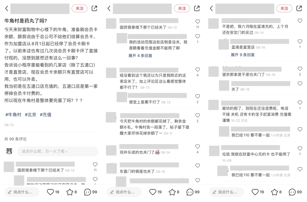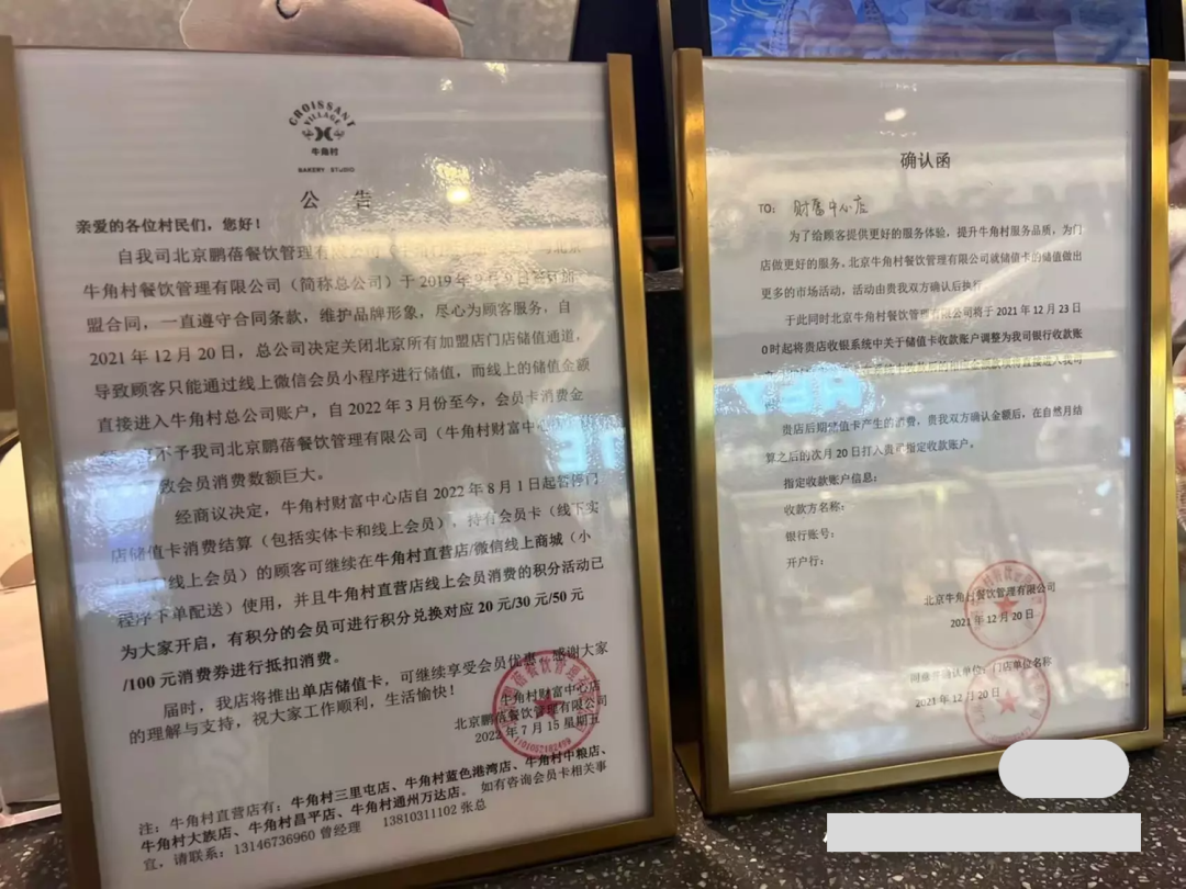 不久前,牛角村北京財(cái)富中心店張貼公告,稱牛角村總公司自2021年12月20日起,決定關(guān)閉北京所有加盟門店的儲值通道,財(cái)富中心店自2022年8月1日起暫停門店儲值卡消費(fèi)結(jié)算。