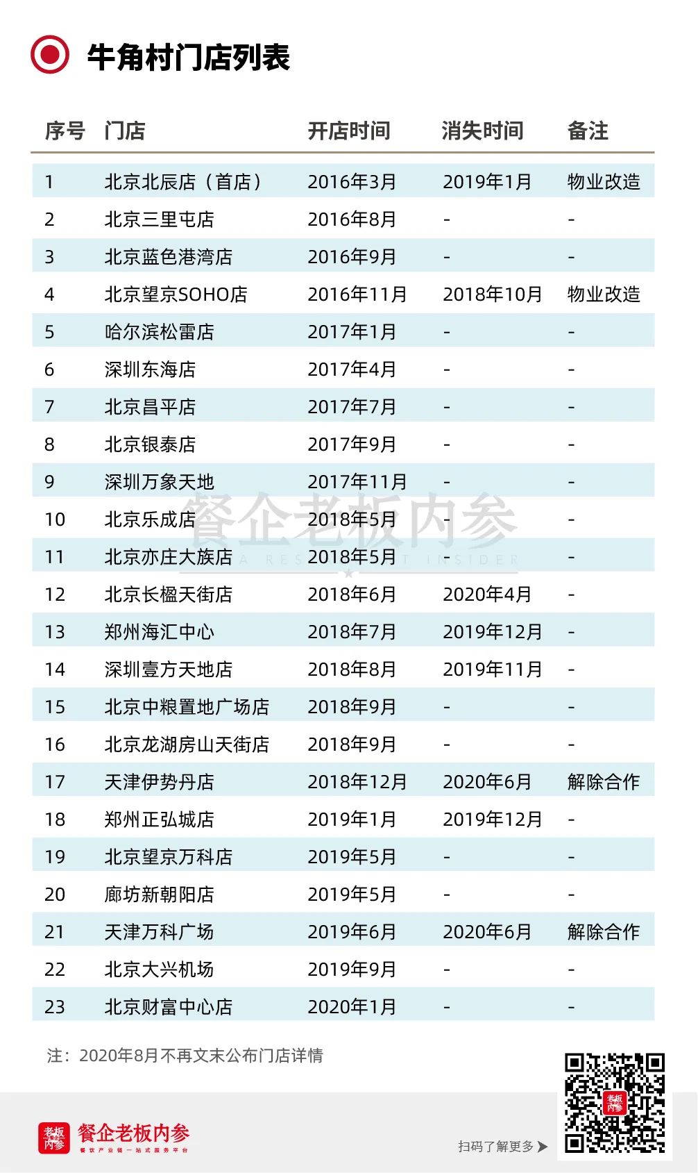 8月后,牛角村微信推文末尾后不再羅列門店信息!干w牌」前最后一次披露的門店數(shù)為15家。