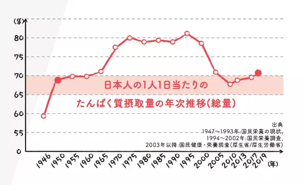 日本厚生省/厚生勞動省的國民營養(yǎng)調(diào)查數(shù)據(jù)顯示,日本的人均蛋白質(zhì)攝入量在1996年達到頂峰,并在此之后明顯下降。到2019年時,日本人均蛋白質(zhì)攝入量只有71.4克,勉強與20世紀50年代相持平。