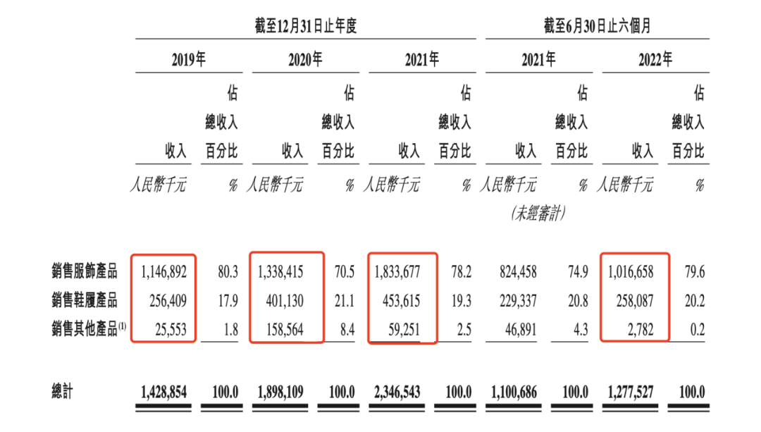 最后是產(chǎn)品單一依賴癥。不語(yǔ)的主要售賣(mài)衣服和鞋子,招股書(shū)顯示,2022年上半年銷(xiāo)售服飾產(chǎn)品占總收入的79.6%,鞋履產(chǎn)品占據(jù)20.1%,兩者的營(yíng)收占比之和接近100%。
