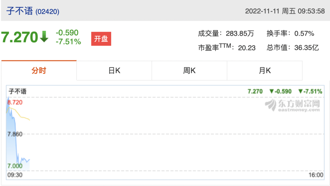 11月11日,跨境電商企業(yè)子不語(yǔ)正式登陸港交所,股票代碼為02420.HK,開(kāi)盤(pán)漲7.51%,報(bào)8.57港元每股,隨后高開(kāi)低走,現(xiàn)報(bào)7.27港元每股,低于發(fā)行價(jià)7.86港元,總市值36.35億港元。