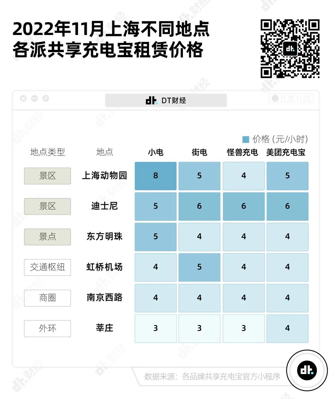 我們隨機選擇了上海幾個不同地點(包括景區(qū)、交通樞紐、商圈、外環(huán))的充電寶點位,并統(tǒng)計了四家頭部共享充電寶品牌的收費。