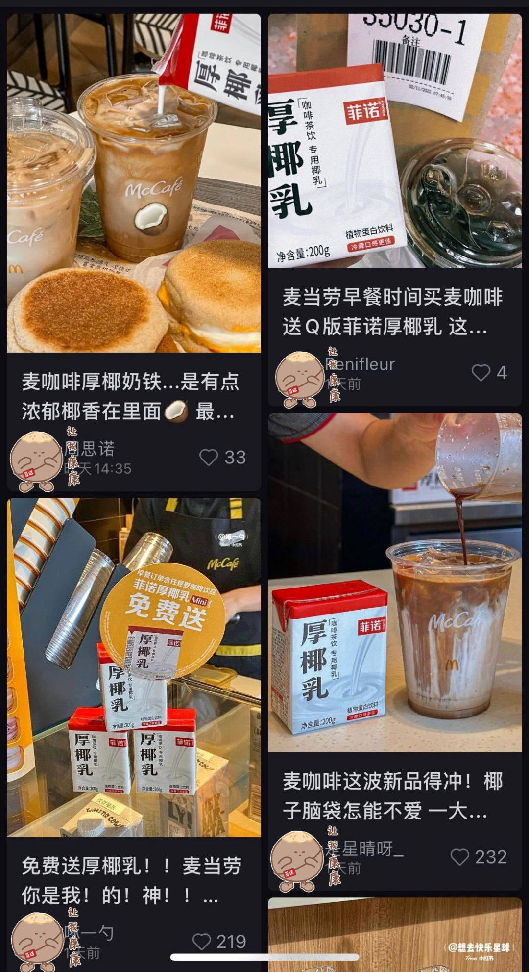 事實上,這并不是菲諾和麥咖啡的第一次互動。今年4月,菲諾就聯(lián)手麥咖啡進行了“噢椰!燕麥厚椰拿鐵自由”快閃活動;5月,菲諾還攜手麥咖啡推出“濃濃厚椰季”系列產(chǎn)品……麥咖啡特色小黃車搭載著厚椰拿鐵以及Mini菲諾厚椰乳,在北京、上海吸引了許多消費者前來打卡。