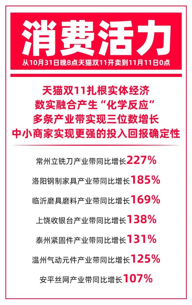 天貓雙11:多條產(chǎn)業(yè)帶實(shí)現(xiàn)三位數(shù)增長