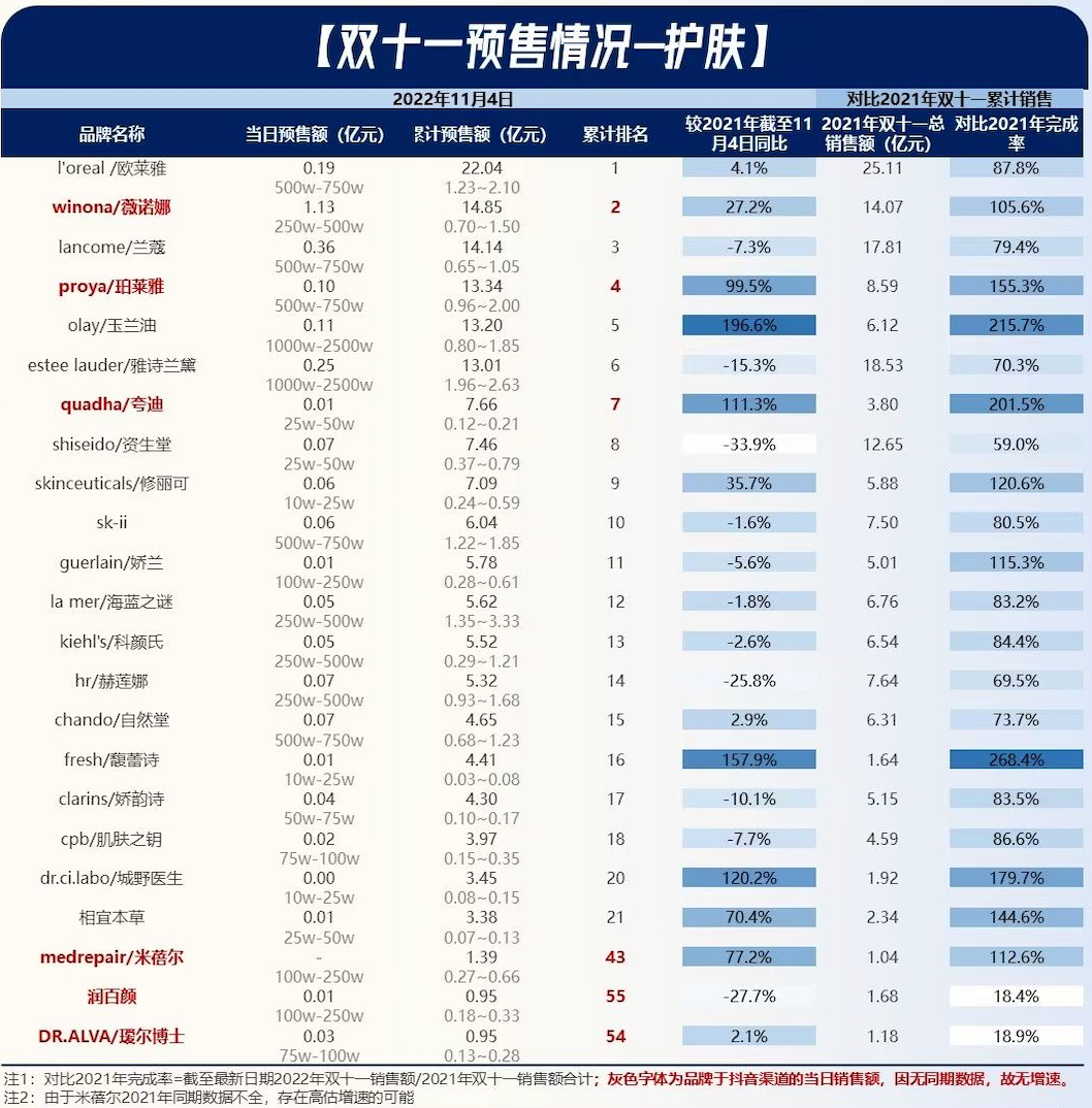 天貓雙11首輪預售護膚品排行榜及增速,摘自信達新消費,數(shù)據(jù)來源:魔鏡市場情報
