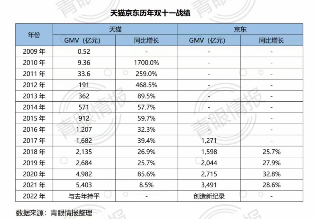 首先從大盤來看,天貓表示,“今年天貓雙11穩(wěn)中向好,交易規(guī)模與去年持平”。京東則稱,“2022年京東11.11全球熱愛季超越行業(yè)增速,創(chuàng)造了新的紀錄!倍ツ,天貓雙11累計成交額5403億元,同比增速為8.5%;京東雙11成交額為3114億元,增速為15%。