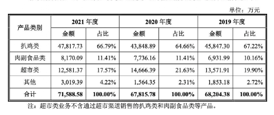 拆解“德州扒雞”企業(yè)類招股書就不難發(fā)現(xiàn),扒雞類產(chǎn)品一直是公司的大頭。其在2019年到2021年的營收分別為4.58億元、4.38億元、4.78億元,占公司總營收比重分別為67.22%、64.66%、66.79%。