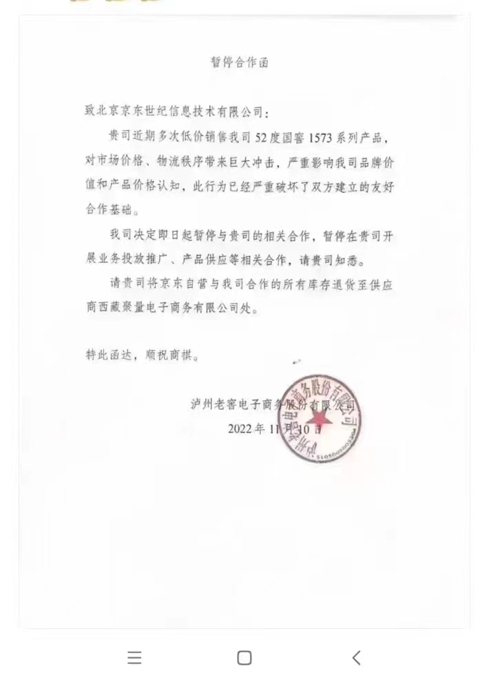 11月11日當天,一封瀘州老窖發(fā)給京東的《暫停合作函》在網上流傳,指出京東多次低價銷售52度國窖1573系列產品,嚴重影響了瀘州老窖品牌價值和產品價值,并決定暫停與京東的相關合作。