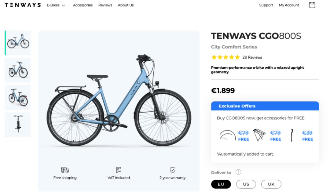 2021年5月,十方運(yùn)動(dòng)科技((品牌名:TENWAYS))注冊(cè)成立,定位是為解決城市通勤而生的電助力自行車品牌,主要面向歐美消費(fèi)者。據(jù)官方介紹,公司成立的短短一年內(nèi),第一次獲得IGG眾籌超85萬美金,迅速在歐洲荷蘭設(shè)立了銷售總部,鋪設(shè)了超200家實(shí)體門店,同時(shí)線上銷售成績不俗。