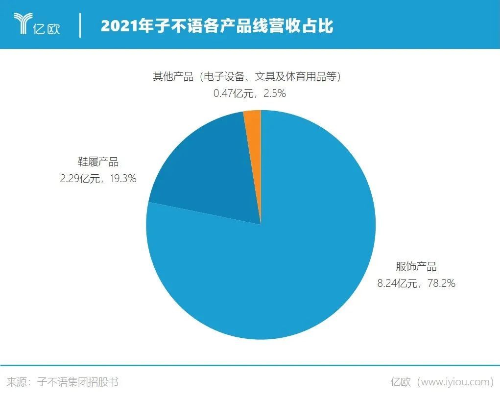 招股書顯示,2021年子不語實(shí)現(xiàn)營(yíng)收23.47億元。從產(chǎn)品結(jié)構(gòu)上看,以服裝為主、鞋履為輔,這兩大類產(chǎn)品的收入分別占總營(yíng)收的78.2%和19.3%;同時(shí),子不語也逐漸向包括電子設(shè)備、文具以及體育用品在內(nèi)的其他產(chǎn)品發(fā)力布局,不過這部分收入目前只占總營(yíng)收的2.5%。