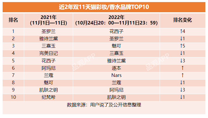 細分至護膚品類,今年雙11天貓護膚品牌TOP10中,有5個品牌維持了去年的排名,珀萊雅、OLAY、修麗可排名上升,資生堂和海藍之謎排名下降。其中,后、赫蓮娜掉出TOP10。