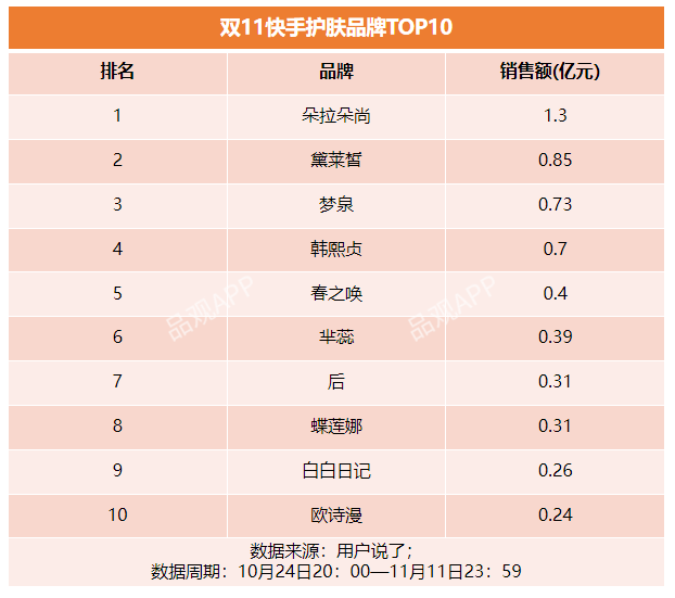 朵拉朵尚通過與快手平臺深度綁定,在今年雙11期間獲得快速增長。今年雙11朵拉朵尚以1.42億元居于快手雙11美妝品牌榜首。在快手美妝個護熱銷商品TOP20榜單中,朵拉朵尚也有3款產(chǎn)品上榜。