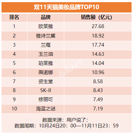 根據(jù)用戶說了數(shù)據(jù),今年雙11期間,天貓平臺美妝總GMV高達420億元,銷量超2億件,TOP20品牌GMV累計超191億元,TOP5品牌GMV均超13億。