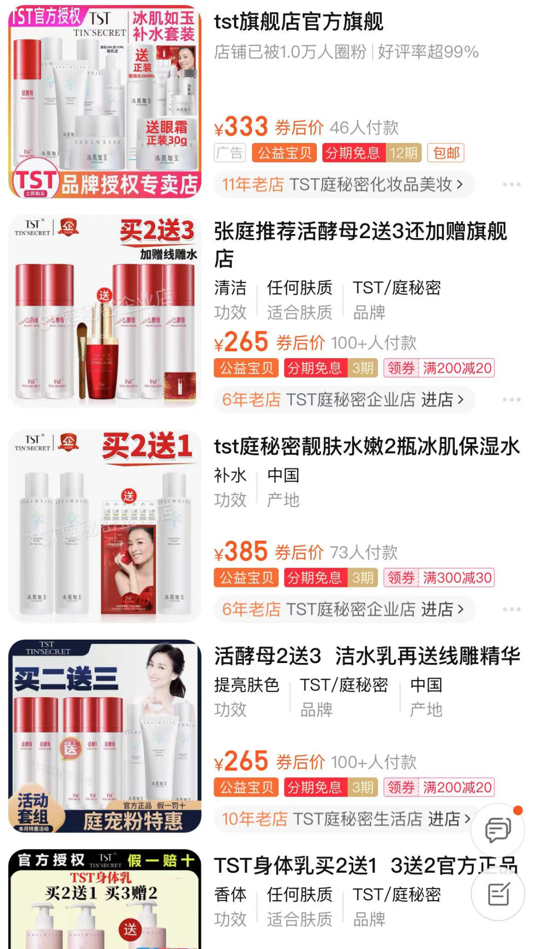 張庭的事件并沒(méi)有從此停息。時(shí)至今日,在眾多電商平臺(tái)仍能看到各類“代理”銷售的TST庭秘密產(chǎn)品。