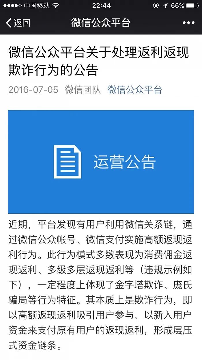 早年,微信因微商的聲譽(yù)頭痛不已,不少用戶把微商和傳銷劃等號(hào)。2016年,騰訊曾公布了《微信公眾平臺(tái)關(guān)于處理返利返現(xiàn)欺詐行為的公告》,打擊“消費(fèi)傭金返現(xiàn)返利、多級(jí)多層返現(xiàn)返利”。騰訊雖沒(méi)有明說(shuō),但主要針對(duì)的就是三級(jí)分銷模式。近些年來(lái),微信也是整頓動(dòng)作不斷。