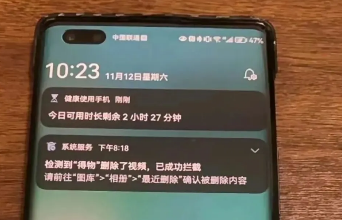 然而,后續(xù)該網友卻驚訝地在手機中看到來自系統(tǒng)的提示——“檢測到‘得物’刪除了視頻,已成功攔截”?吹较到y(tǒng)提示的網友認為,得物通過獲取手機權限對其所存儲的證據視頻進行刪除。