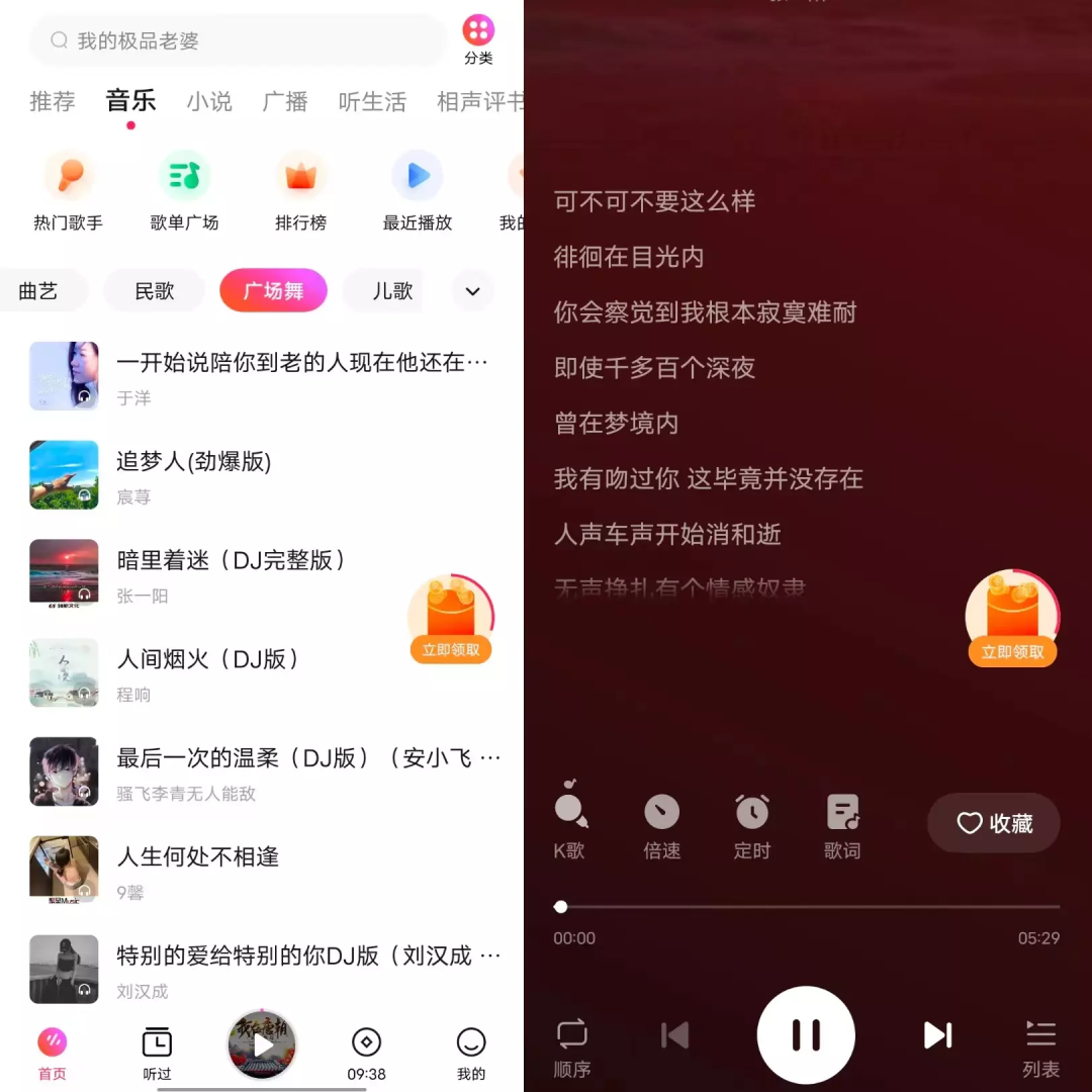 圖注:番茄暢聽(tīng)音樂(lè)版APP內(nèi)的首頁(yè)和播放器界面。