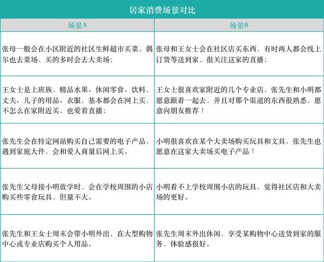我們說的這個“到位”,是指在顧客的全渠道場景中,占據(jù)主場景份額!拿家庭來舉例子,比如張先生、張?zhí)、小明、張父、張母一?口,可能有以下A/B兩種場景:
