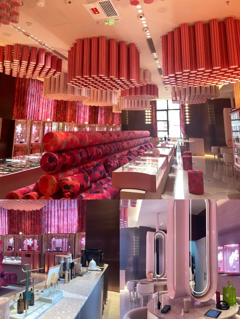 從外觀上來看,首家“頌”主題店以“優(yōu)雅裝扮”為主題線,融合了裝扮時所使用的口紅、化妝鏡、香水等元素,因為坐落武漢,還加上了武漢的“櫻花”元素。遠遠看過去,像是被櫻花籠罩的城堡。