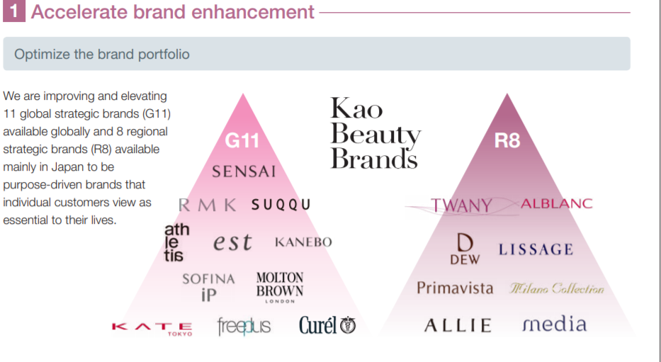 眼見資生堂、高絲等重點布局高端市場的美妝集團乘著消費升級的東風賺得盆滿缽滿。2018年,花王“痛定思痛”揮刀裁撤了集團旗下30個業(yè)績不佳的化妝品品牌,僅保留19個,分為本土品牌(R8)和全球品牌(G11)兩大類別。Kanebo Cosmetics旗下的SENSAI就屬于11個全球品牌之一,2012年的數(shù)據(jù)顯示,SENSAI占Kanebo Cosmetics海外業(yè)績的40%,主要由歐洲、中東市場所貢獻。根據(jù)花王年報對旗下品牌的分類布局,SENSAI也是集團旗下唯一的高端護膚品牌。
