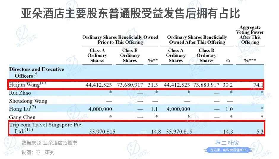 據(jù)招股書(shū)披露,王海軍(即耶律胤)持股32.2%,為亞朵的第一大股東;攜程集團(tuán)持股14.3%,為其第四大股東。