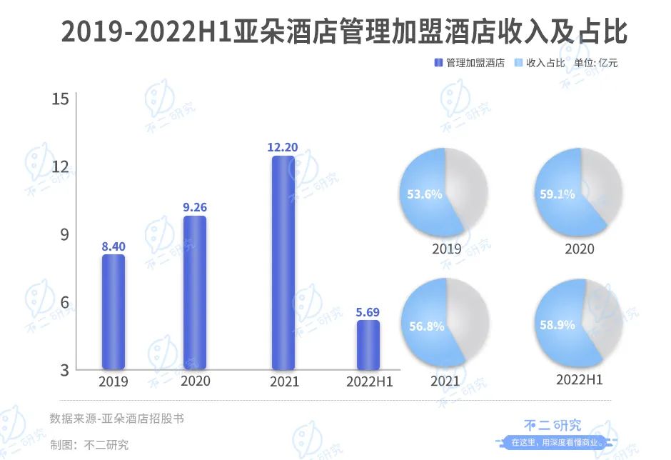 具體來(lái)看,管理加盟酒店收入是其營(yíng)收支柱,在總營(yíng)收占比一半以上。2019-2022上半年,來(lái)自管理加盟酒店收入分別為8.40億、9.26億、12.2億和5.69億,占總營(yíng)收比例分別為53.6%、59.1%、56.8%和58.9%。