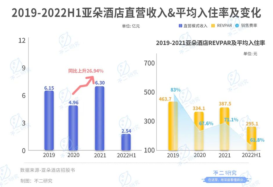 第二類(lèi)收入租賃酒店(即直營(yíng)模式),考慮到2020年疫情影響,各類(lèi)酒店的營(yíng)收均出現(xiàn)不同程度的下滑:亞朵在2020年直營(yíng)收入為4.96億元,較2019年的6.15億元,下滑了19%;2021年,直營(yíng)收入回升至6.30億元,同比上升26.94%;2022上半年,直營(yíng)收入為2.54億元,同比下降17.59億元。