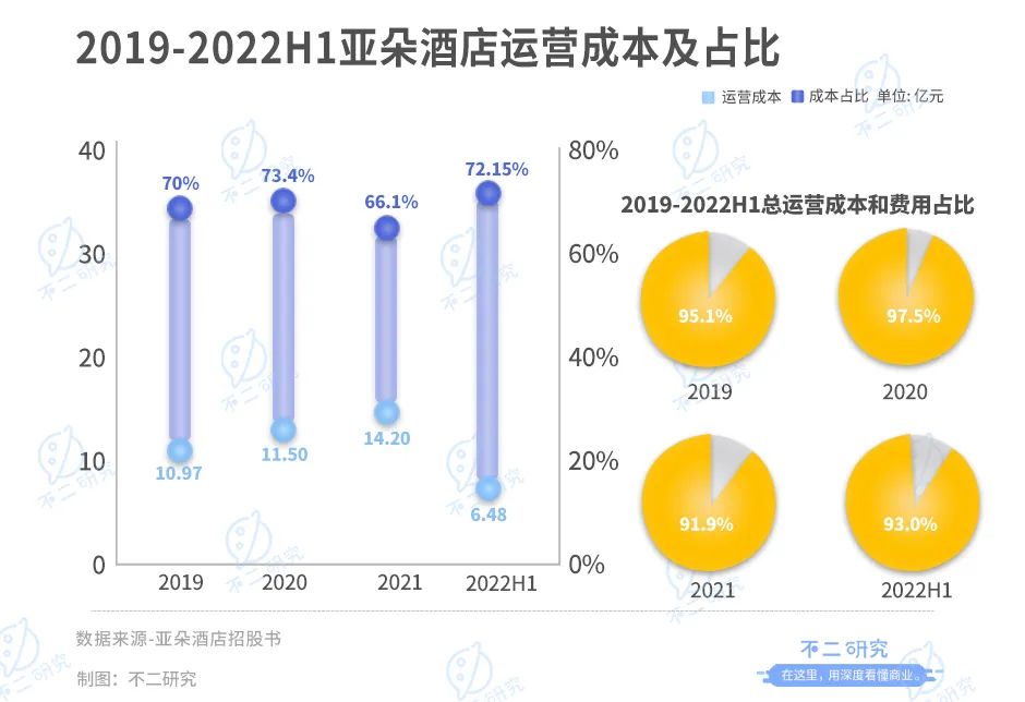 「不二研究」發(fā)現(xiàn),2019年,亞朵的酒店運(yùn)營(yíng)成本高達(dá)10.97億,總營(yíng)收占比70%;2020年達(dá)11.50億元,占亞朵總營(yíng)收的73.4%。這一占比在2021上半年也未能有明顯好轉(zhuǎn),運(yùn)營(yíng)成本6.48億元,依舊高達(dá)72.15%。