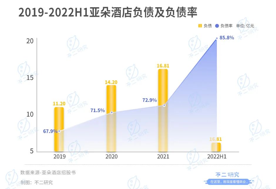 「不二研究」發(fā)現(xiàn)亞朵的負(fù)債情況并未好轉(zhuǎn):2019-2022上半年,其總負(fù)債分別為11.20億、14.20億、16.81億和5.57億;同期,其負(fù)債率高達(dá)67.9%、71.5%、72.9%和85.8%。