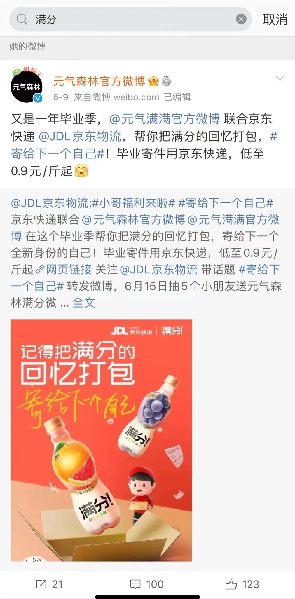 搜索“滿分微氣泡”相關(guān)動(dòng)態(tài),發(fā)現(xiàn)大多新聞稿還停留在2021年。2022年起,品牌在小紅書上投放的種草宣傳明顯減少。而元?dú)馍值墓俜轿⒉衲陜H轉(zhuǎn)發(fā)過(guò)一條滿分相關(guān)的微博。