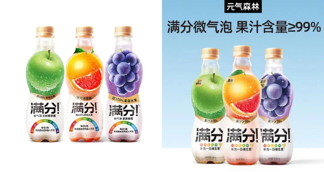 第二次的改變,則對(duì)包裝進(jìn)行了“整體改造”。滿分告訴我們,以前的設(shè)計(jì)讓用戶無(wú)法區(qū)分滿分和氣泡水的區(qū)別,感受不到真實(shí)果汁。品牌希望產(chǎn)品的包裝設(shè)計(jì),能將滿分的價(jià)值傳達(dá)出去。