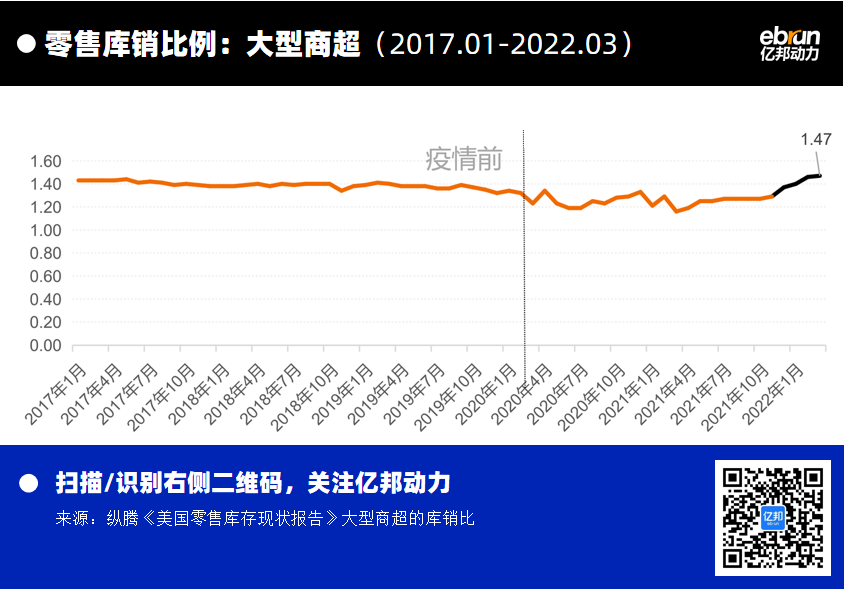 大型商超的零售庫銷比(庫存量與銷售額的比率,比率高說明庫存量過大,銷售不暢,過低則可能是生產(chǎn)跟不上)一直在1.2~1.4左右范圍內(nèi)波動(dòng)。美國(guó)疫情爆發(fā)后,庫銷比由波動(dòng)轉(zhuǎn)為緩慢上升,2021年12月后則加速攀升,到2022年3月達(dá)到1.47,這表明大型商超的庫存過剩。