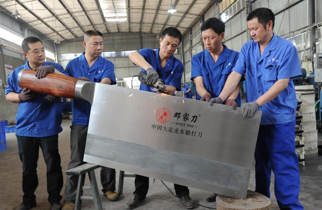 如今,大足有著極具重慶地方特色的五金產(chǎn)業(yè)集群,享有“中國西部五金之都”“中國鍛打刀剪中心”的美譽,特別是菜刀聞名全國,產(chǎn)量位居全國“前三甲”。而“鄧家刀”便是其中的翹楚,獲得重慶老字號品牌稱號,也是重慶市市級非物質(zhì)文化遺產(chǎn)“龍水小五金鍛打技藝”的傳承單位。