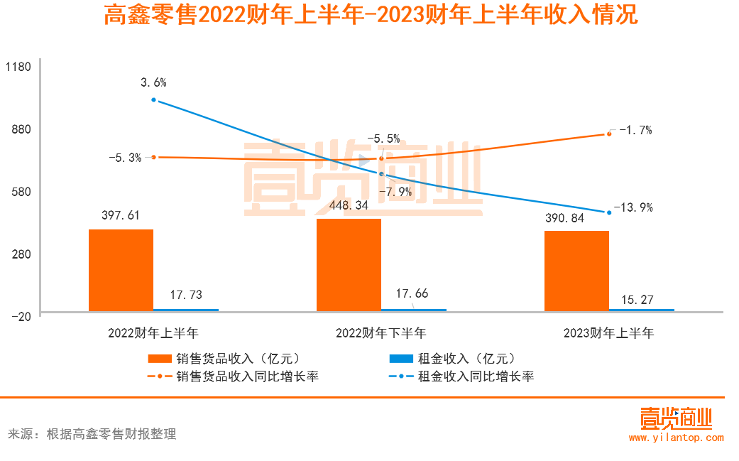 高鑫零售的營收主要分為商品銷售收入和租金收入。2023財年上半年,高鑫零售營收406.11億元,同比下滑2.2%。其中,商品銷售收入390.84億元,同比下跌1.7%,與去年同期基本持平。在今年的經(jīng)濟形勢下,這一數(shù)據(jù)在商超行業(yè)中表現(xiàn)還不錯。
