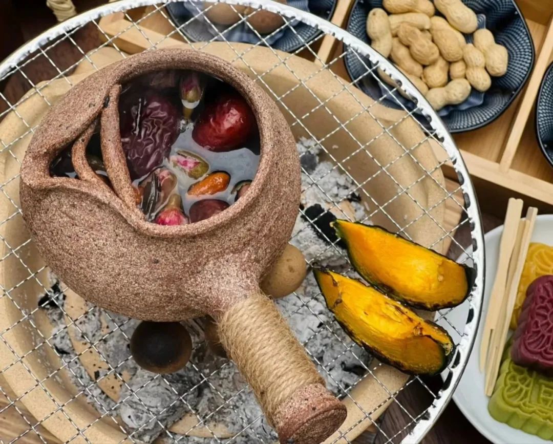 一只小炭爐,一張鐵絲網(wǎng)盤(pán),一柄陶制茶壺,茶壺邊再擺滿精致的茶點(diǎn),背景里則是竹椅、泥墻、典雅的院落和晴朗的天空……這樣一套明顯與繁忙都市生活拉開(kāi)距離的悠閑場(chǎng)景,不但是潮人們?cè)诰W(wǎng)上親測(cè)打卡的流行元素,也成為了“圍爐煮茶”的固定搭配。