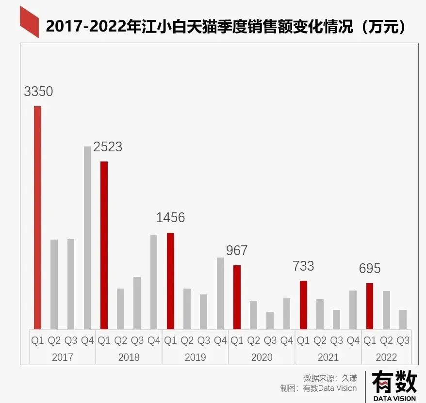 至于線上,別看江小白在社交媒體風(fēng)起云涌,但它的線上銷售額卻不值一提。在天貓,今年一季度只賣出了695萬,僅有2017年同期銷售額的20%。