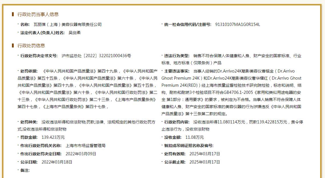 據(jù)青眼調(diào)查,2021年10月12日,上海市場(chǎng)監(jiān)管部門曾通報(bào),瓦麗葆生產(chǎn)的“Dr.Arrivo”牌Dr.Arrivo24K魅影美容儀 香檳金(規(guī)格型號(hào):Dr.Arrivo Ghost Premium 24K),在電源適配器中固定電源插銷的塑料部件的耐熱球壓試驗(yàn)中,壓痕直徑實(shí)測(cè)為3.64mm(標(biāo)準(zhǔn)要求應(yīng)≤2mm),與國(guó)家強(qiáng)制性標(biāo)準(zhǔn)要求不符。通報(bào)稱,該指標(biāo)不合格,長(zhǎng)時(shí)間使用可能導(dǎo)致外殼融化,導(dǎo)致材料不能固定住帶電部件,使帶電部件接觸不良,發(fā)熱嚴(yán)重甚至引發(fā)火災(zāi)危險(xiǎn)?梢,此次處罰也是對(duì)去年通報(bào)的處理結(jié)果。