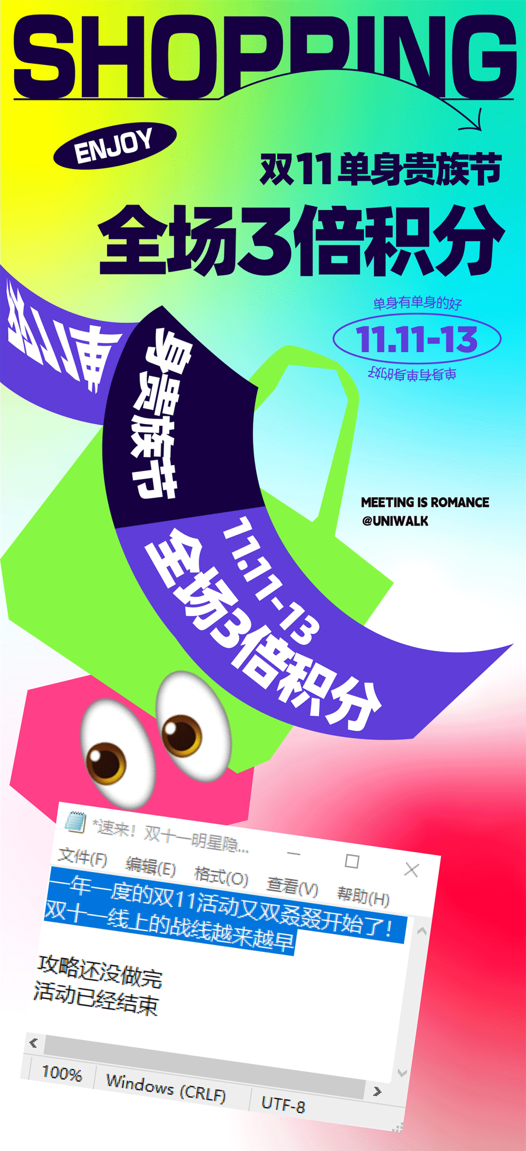深圳前海壹方城在雙十一期間以“解憂脫單便利店”為情感話題,打造了“單身貴族節(jié)”活動,全場3倍積分、美妝團券、品牌快閃店、大牌零售、限時搶殺、聯(lián)合政府補貼3C數(shù)碼品牌、餐飲一人食等適合單身群體特性的奇妙玩法,極大地引起了單身人群的情感共鳴。
