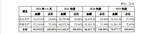 而這也就讓外協(xié)生產(chǎn)模式的產(chǎn)品占比“居高不下”,合理及是否可持續(xù)成為了關(guān)注點(diǎn)。2019 年度至 2022年 1-6 月,公司各期外協(xié)產(chǎn)品入庫(kù)金額占比分別為 72.63%、71.54%、75.94%和 75.34%。