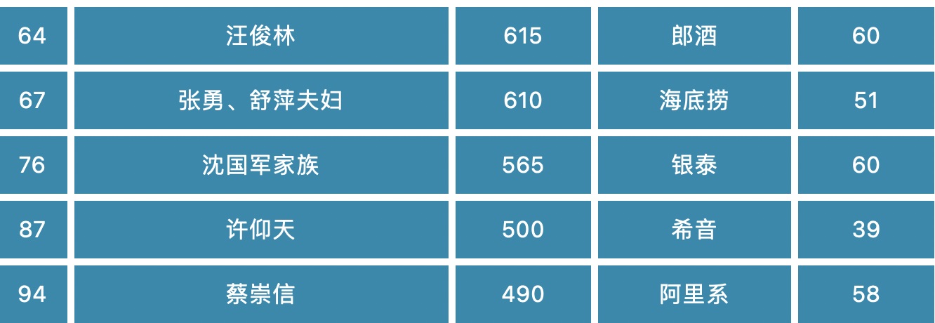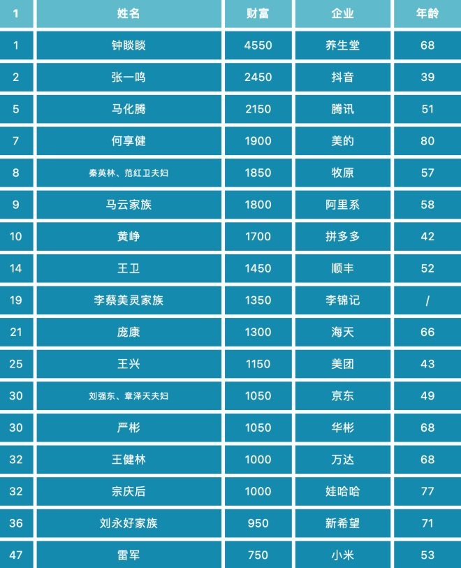 財富單位:億元人民幣 年齡:顯示主要人物