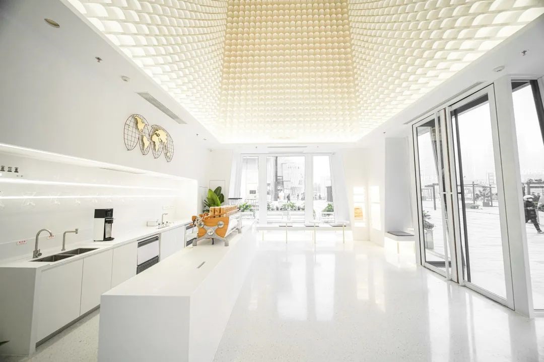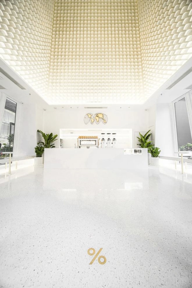 白色釉面的材質(zhì)與% ΔRΔBICΔ 整個(gè)空間相得益彰,最頂部代表匠人精神和咖啡櫻桃的%Logo以一種強(qiáng)有力的姿態(tài)冠蓋整個(gè)空間,展現(xiàn)了西安這座歷史名城的宏偉。