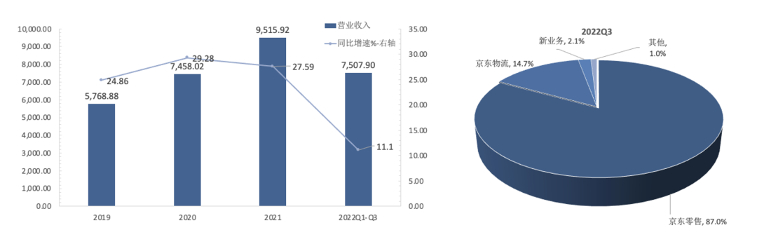 2022年前三季度,京東實現(xiàn)營業(yè)收入7507.9億元,同比增長11%,營收同比與H1基本持平。京東在2022Q3單季實現(xiàn)收入2435億元,同比增長11.4%,環(huán)比下降9%,與市場預期基本一致。