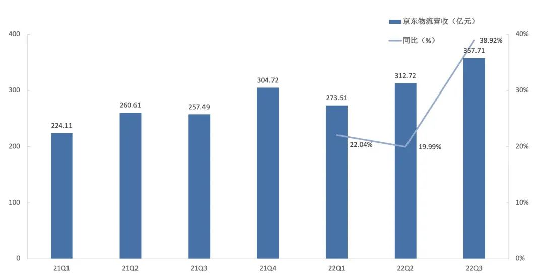本季度,京東物流業(yè)務實現(xiàn)收入357.71億元,同比增長38.92%。2022Q3同比漲幅明顯擴大,主要系第三季度疫情影響弱化,物流行業(yè)大幅恢復,以及首次與德邦股份的并表增厚收入。