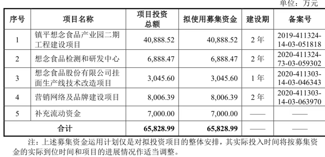 經(jīng)過調(diào)整后的想念食品,此次上市計劃募資9.74億元,發(fā)行不超過3600萬股,不低于發(fā)行后總股本的 25%。其中,6.58億元用于鎮(zhèn)平想念食品產(chǎn)業(yè)園二期工程建設(shè)項目;4330.27萬元用于想念食品掛面車間技改項目;6888.4萬元用于想念食品檢測和研發(fā)中心;2.04億元用于營銷網(wǎng)絡(luò)及品牌建設(shè)項目。