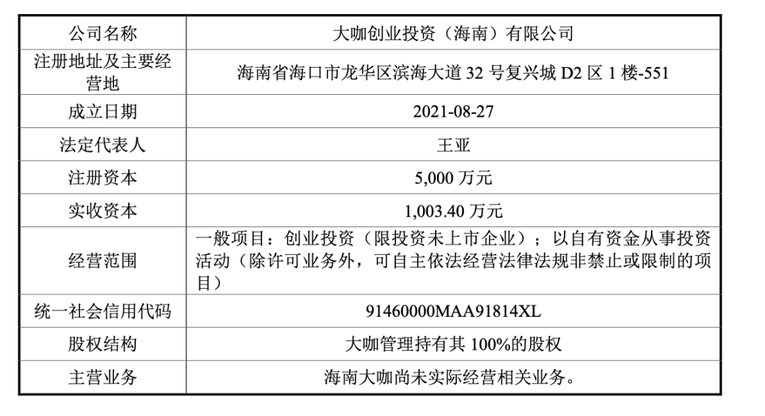 大咖創(chuàng)投于2021年8月成立于海口市,主要從事投資活動。