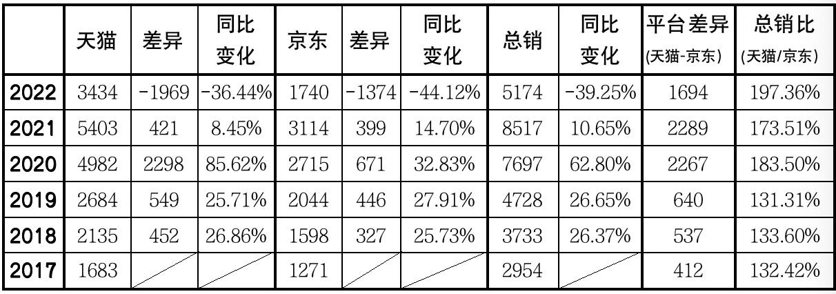 ·由于兩平臺(tái)均出現(xiàn)業(yè)績(jī)暴跌,故平臺(tái)間差距較往年有所拉近,但在總銷比方面,天貓已近京東一倍(197.36%),差距實(shí)則進(jìn)一步拉大,京東掉隊(duì)明顯;