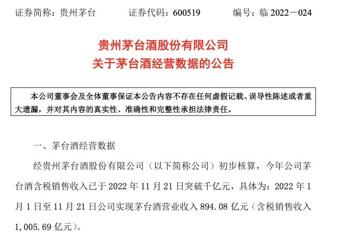 公告稱,貴州茅臺(tái)今年茅臺(tái)酒含稅銷售收入已于2022年11月21日突破千億元,具體為:2022年1月1日至11月21日公司實(shí)現(xiàn)茅臺(tái)酒營(yíng)業(yè)收入894.08億元(含稅銷售收入 1,005.69億元)。