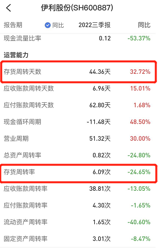 另外頗為尷尬的是,雖加大了銷售費(fèi)用的投入,但伊利的庫(kù)存周轉(zhuǎn)天數(shù)卻出現(xiàn)了增加,據(jù)雪球的數(shù)據(jù),截至三季度末,伊利庫(kù)存周轉(zhuǎn)天數(shù)為44.36天,同比增長(zhǎng)32.72%,此外,與周轉(zhuǎn)天數(shù)同比增長(zhǎng)相對(duì)應(yīng)的,則是庫(kù)存周轉(zhuǎn)率24.65%的同比下降。