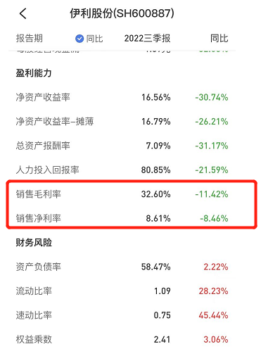 而這一切,在今年伊利發(fā)布Q3財(cái)報(bào)后卻出現(xiàn)了轉(zhuǎn)變。據(jù)財(cái)報(bào)顯示,第三季度歸母凈利潤(rùn)出現(xiàn)了同比26.46%的下降。除此之外,費(fèi)用率同比上升成為投資者關(guān)注的另一問(wèn)題。第三季度公司銷售凈利率為6.32%,同比下降3.01個(gè)百分點(diǎn),環(huán)比二季度下降1.83個(gè)百分點(diǎn)。