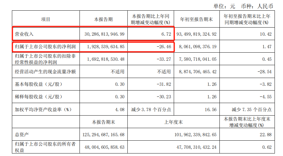 據(jù)伊利發(fā)布的2022年第三季度財(cái)報(bào)顯示,Q3營(yíng)業(yè)收入為302.87億元,同比增長(zhǎng)6.72%,營(yíng)收上漲的同時(shí),歸屬于上市公司股東的凈利潤(rùn)卻出現(xiàn)了26.24%的下滑。